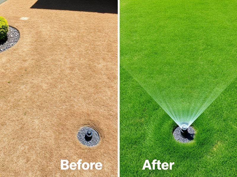Complete sprinkler installation turned this brown lawn into a lush green paradise